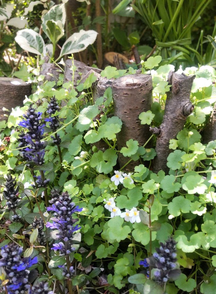 スノーホワイト 緑色の可愛い葉の中に咲いてアジュガといいコラボ🤍💜色んなお花がどんどん咲くね〜🙆♀️🥰🎵