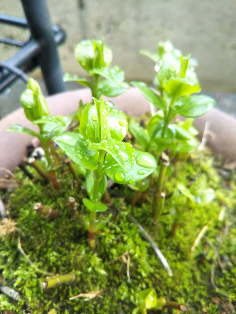 <地道投稿>曇から雨が降ったり、粒雪も😓降り😞今は晴れ⛅️のぞいたり🐈️😽1️⃣「ツルニチリンソウ」動き出しました2️⃣大きくなりました「行者ニクニク」そろそろ食べ頃になります3️⃣「カランコエ?」駐車場で、真っ赤な花🌼咲かせてます⁉️お迎え派手ですが🎵再訂正😣🙇