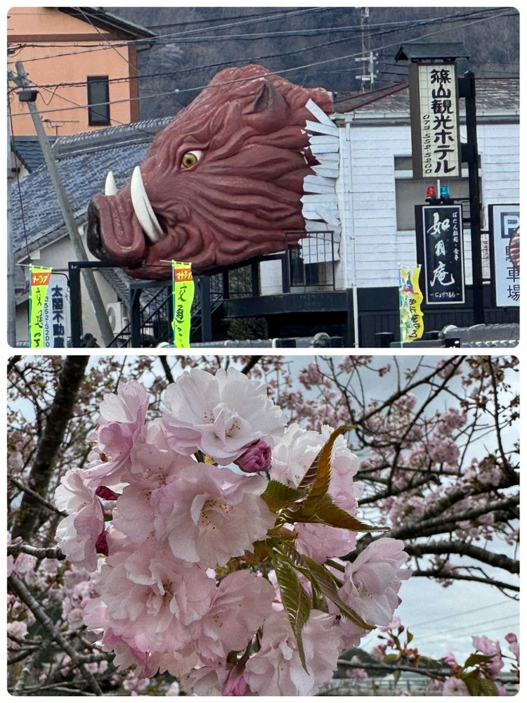 5枚目・丹波篠山の市役所の隣にある、篠山観光ホテルの壁から飛び出している大きな猪🐗です。