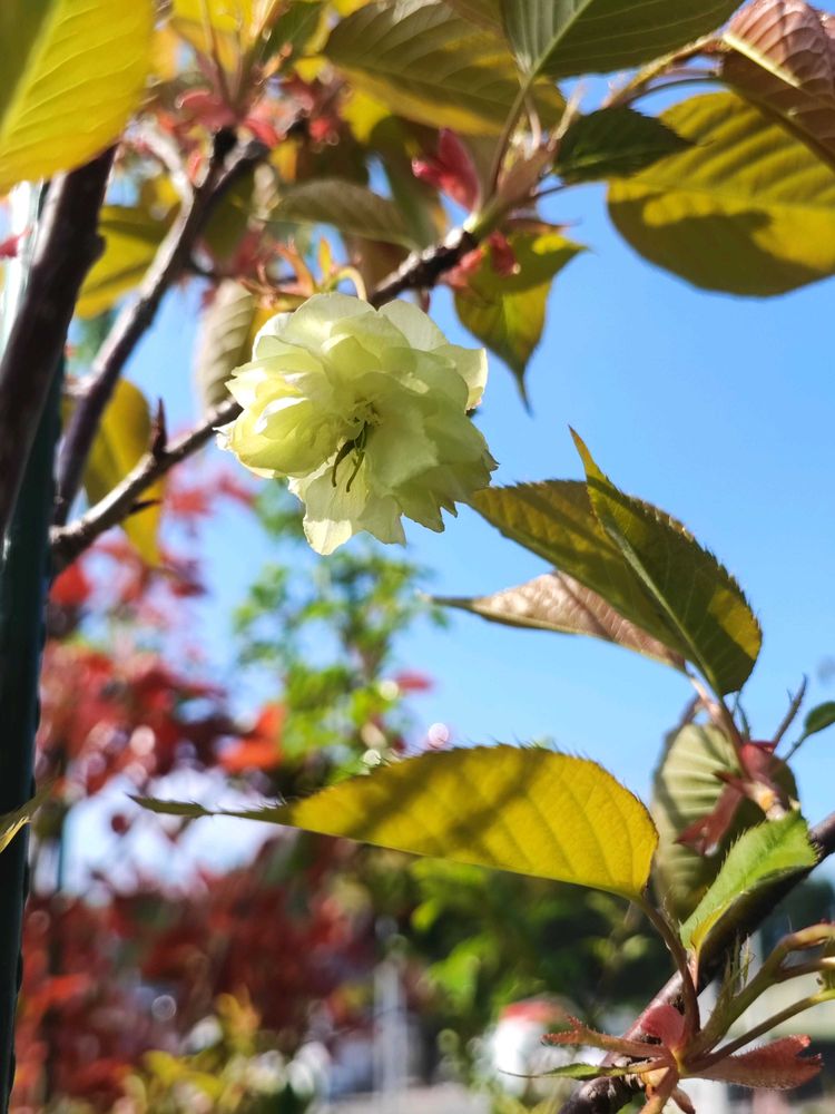 桜 須磨裏普賢象が咲いてました。葉っぱは赤くて花は緑の八重っていう。まだ木も1.2mくらいしかないのでまさか咲いてると思ってなくてビックリしました。