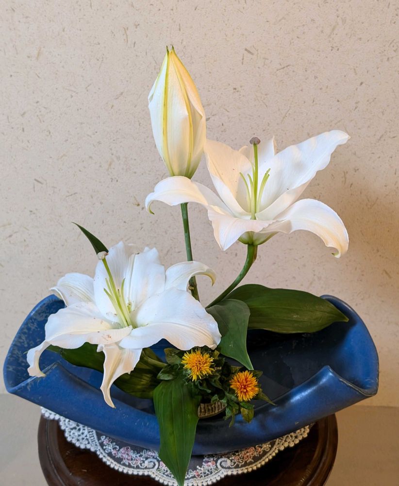 ユニークでありながら、重量感のある花器に百合が入り、安定したアレンジです。