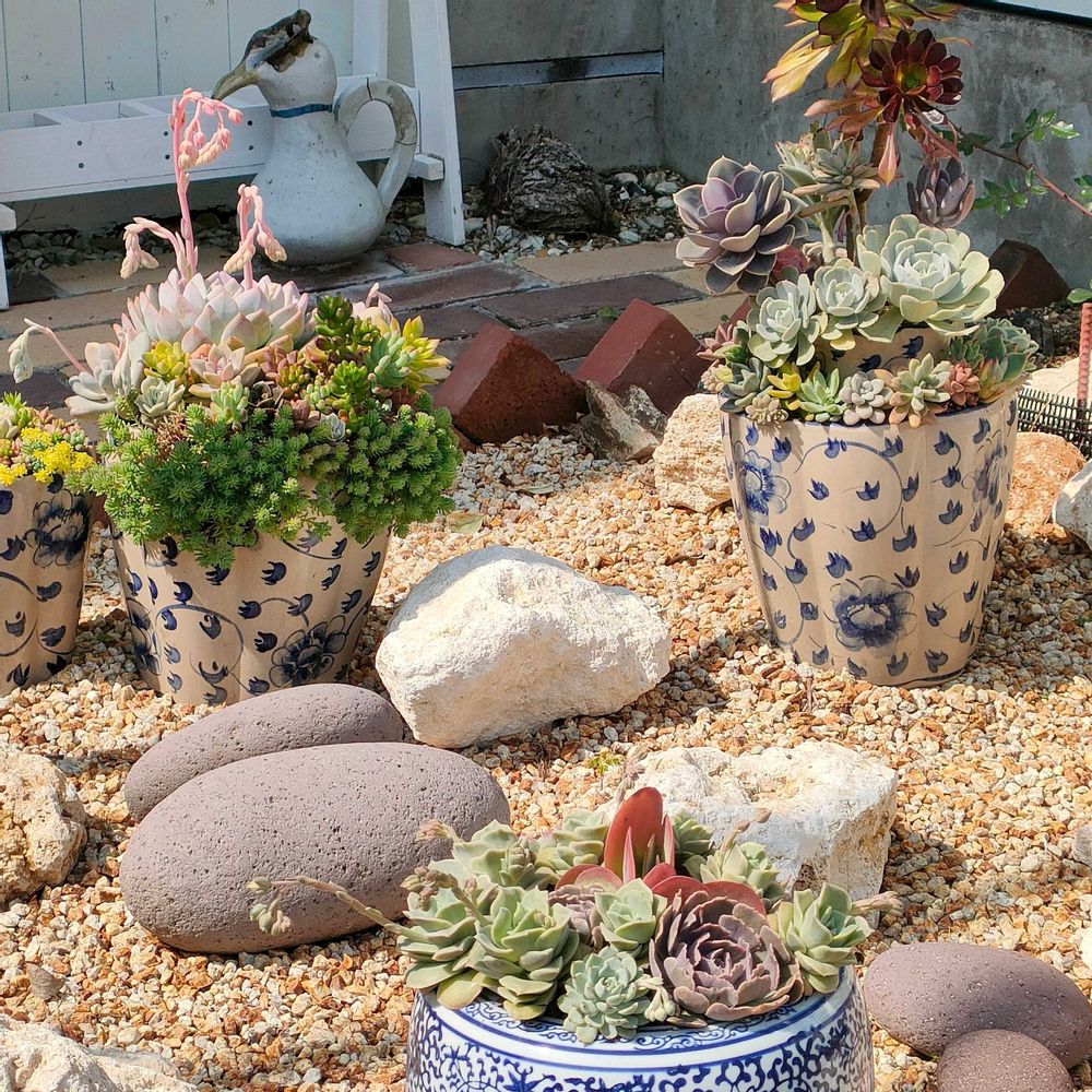 多肉さんが植えてある陶器?の鉢が素敵ですね💖