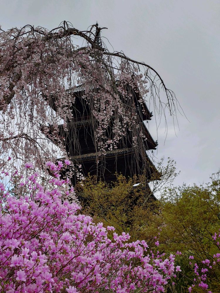 ③紅枝垂れ桜とミツバツツジ、五重の塔の共演も素敵です。