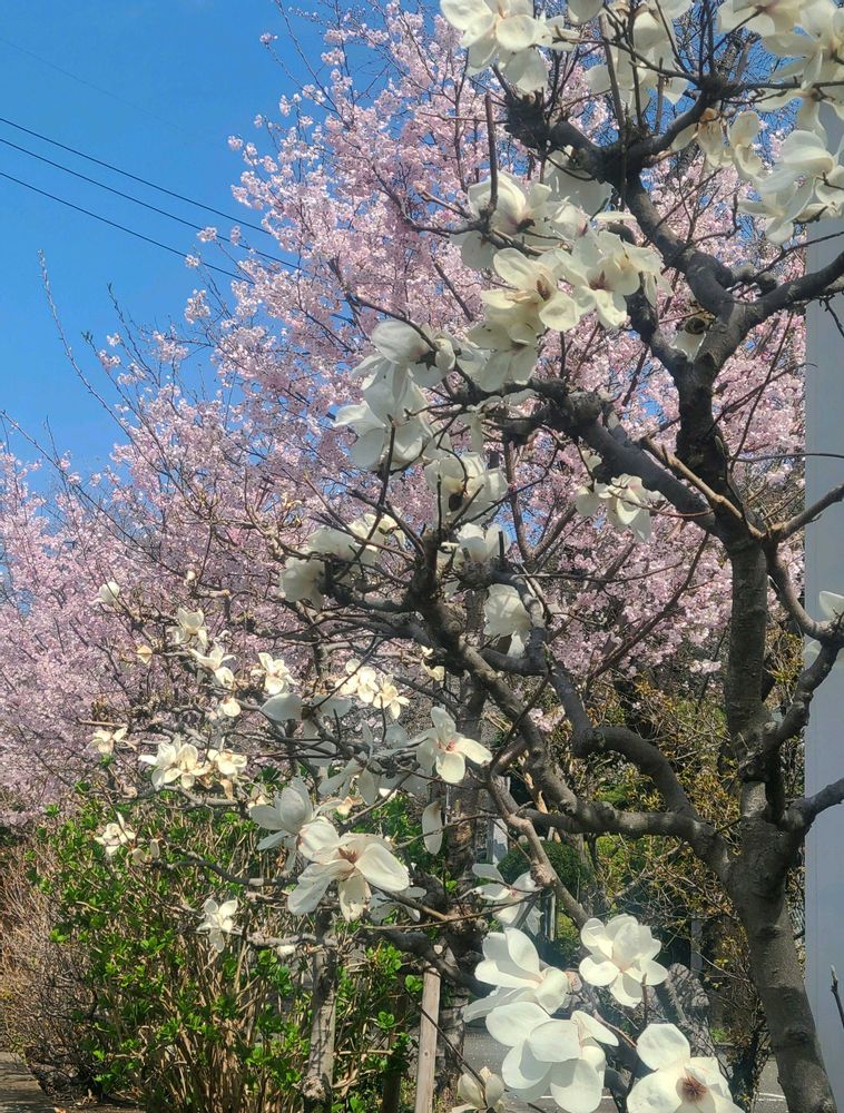 白い木蓮と薄い桃色の桜が青空に向かって咲き誇っていました!また来春も咲いてね💞