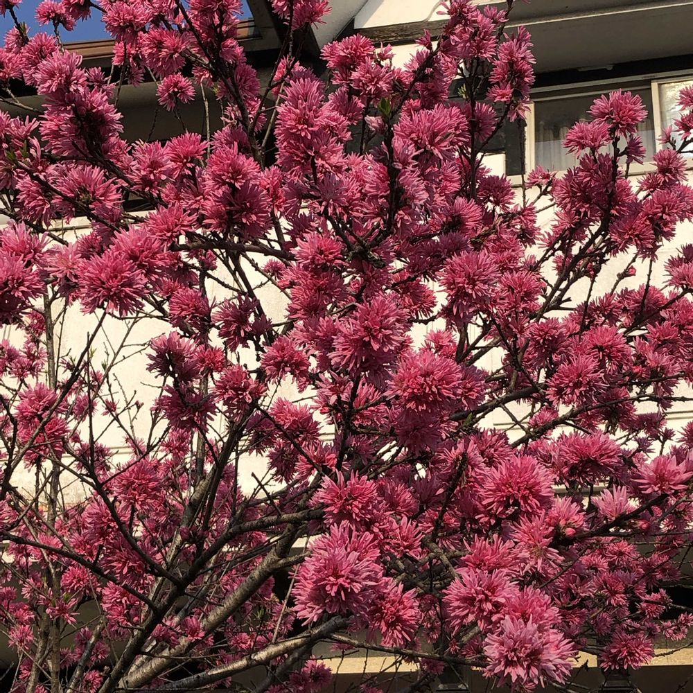 おでかけ先のとあるお店の入り口の花樹。トキワマンサクかと思ったがキクモモ。