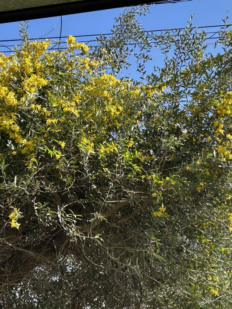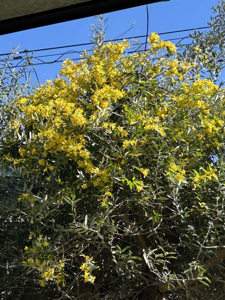 カロライナジャスミンの黄色い花が、オリーブの大木にからまって咲いています🌼