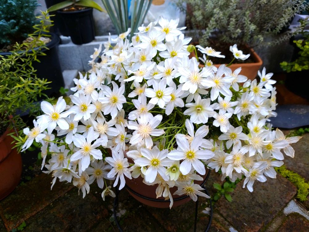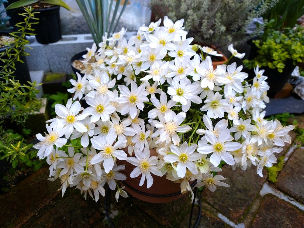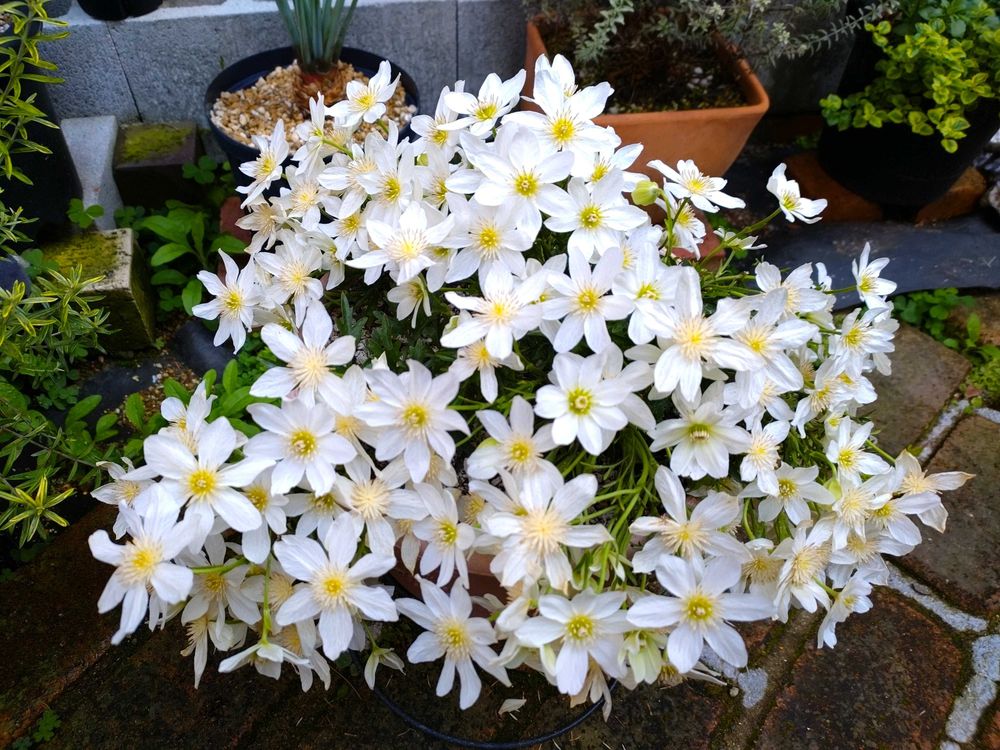 クレマチス・カートマニージョの前回投稿から10日後、半分蕾だった所も咲き満開になりました😍