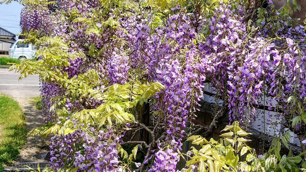 通勤途中の国道沿いのお宅で藤の花が綺麗に咲いてます💜💗💜💗💜🌿