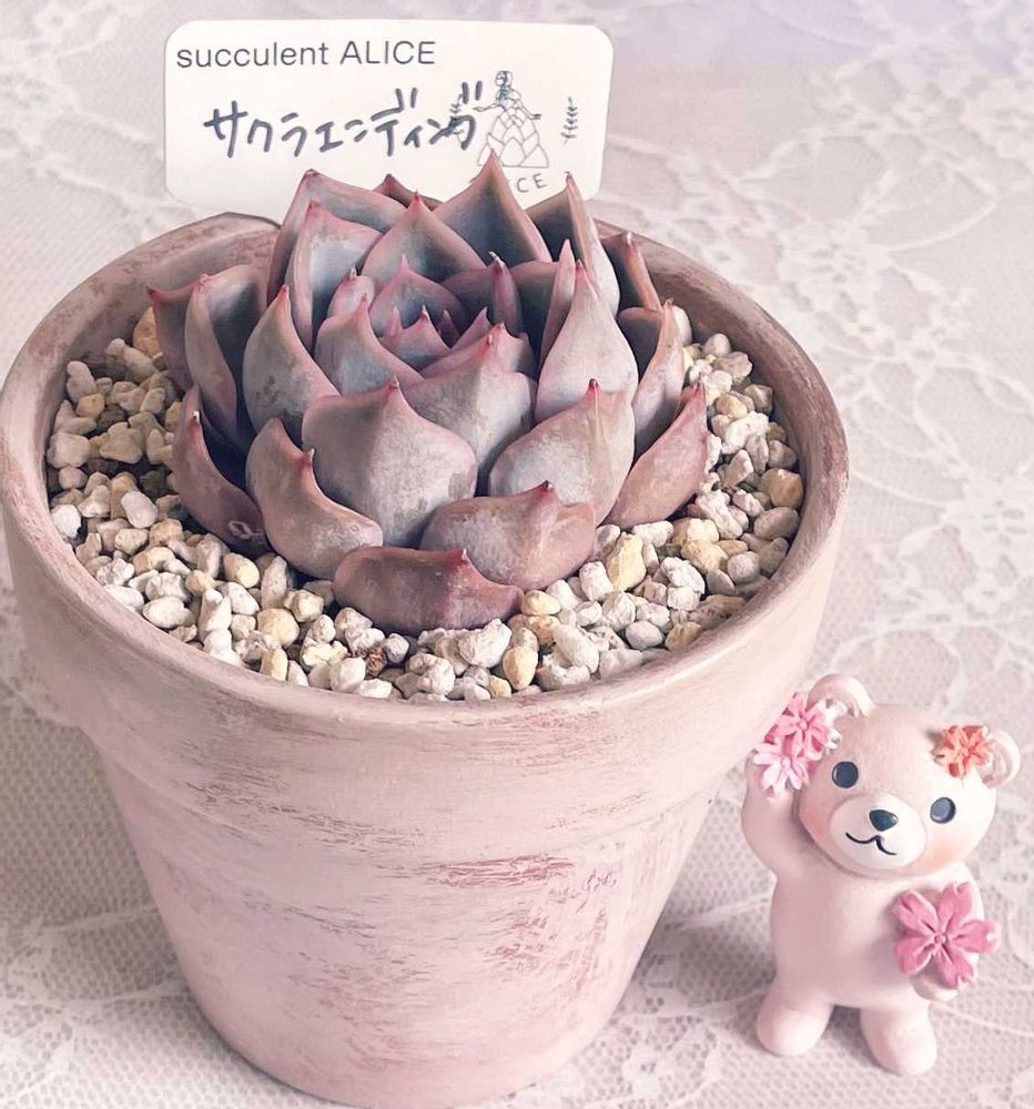 綺麗な色味の多肉さんにお似合いの桜の妖精みたいなくまさんが可愛らしいですね😊🌸🐻