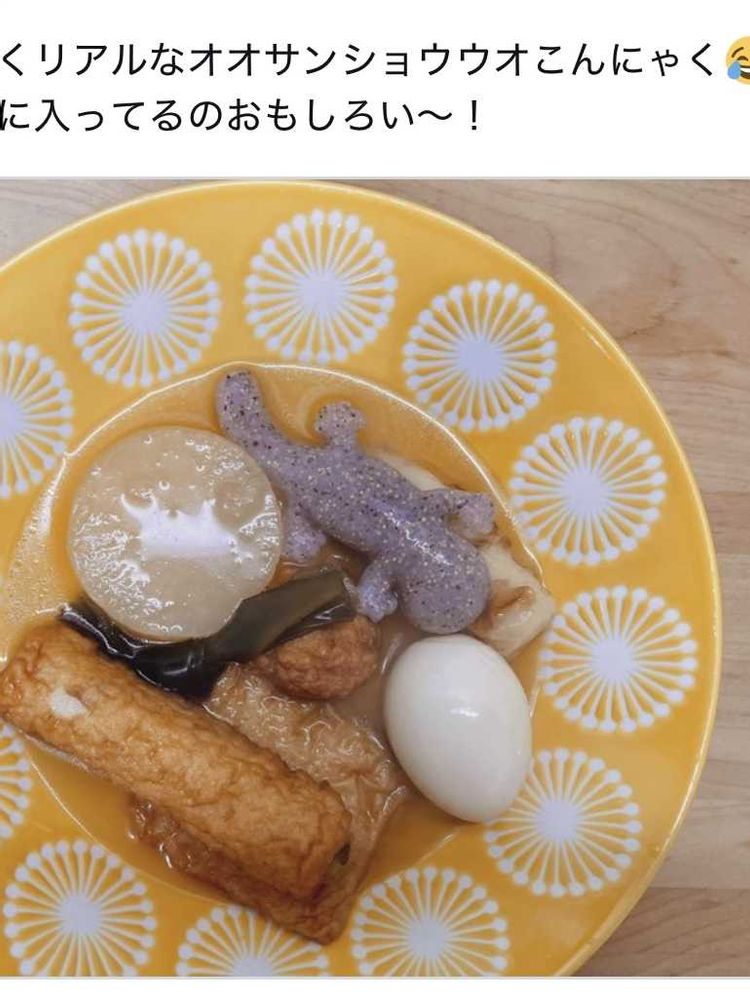おでん🍢の中にコンニャクでも、こんなサンショウウオが入っていたら😱驚いてしまいます!それにしても発想が面白過ぎます🫢😳😆