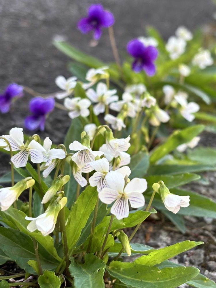 ①②アリアケスミレ ①②は別の場所、先週頃から勢力拡大のお花、今週もご健在。紫のスミレとミックスして美しいなぁと✨白さが眩しい😆✨