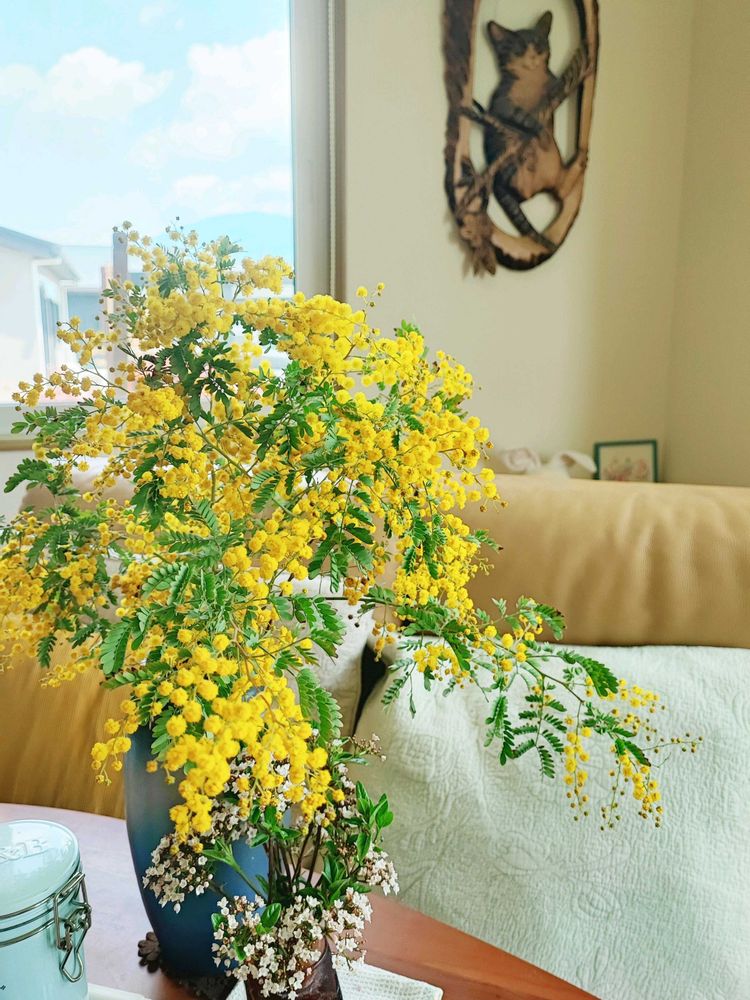 昨日切ったミモザ。これで2枝くらいかな。まだ大半は庭に咲いてますが、長く伸びた枝に葉のない部分が多いので、早めの剪定を兼ねてバッサリ切りました。うちのは銀葉アカシアじゃなくてアカシア デアネイっていう小葉のタイプなので葉っぱだけ見たらオジギソウとかネムノキみたいです。コメリの値下げで大きい鉢植えが安くなってた子ですが、ちゃんと根付いてくれてほっとしました。