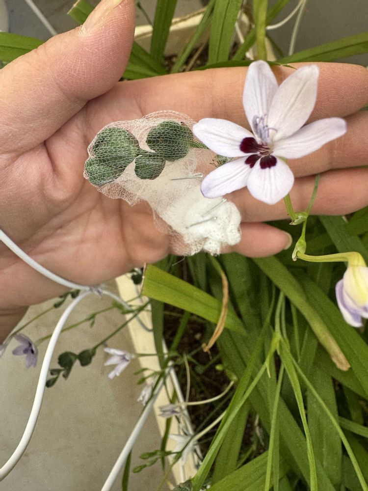 ゴミ取りネットを切って、ホッチキスで止める。この子は種が弾けた