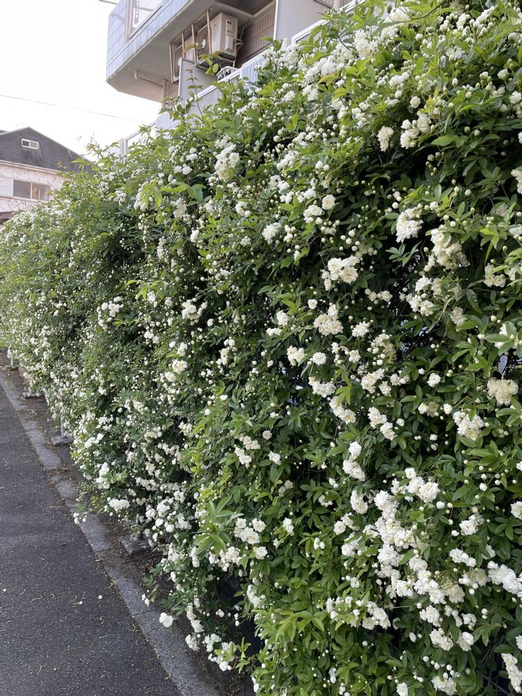 白いモッコウバラと黄色のモッコウバラが盛り盛りに咲いてる😳