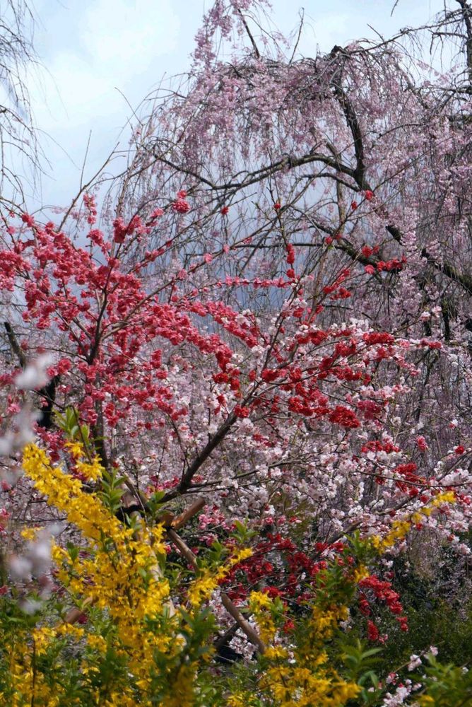 ①紅枝垂れ桜、レンギョウ、ハナモモの共演😆