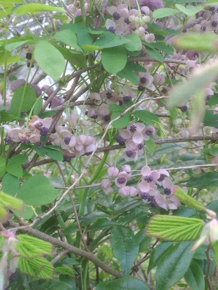 いい香りがするので、ふと見ると、アケビが咲いていました。