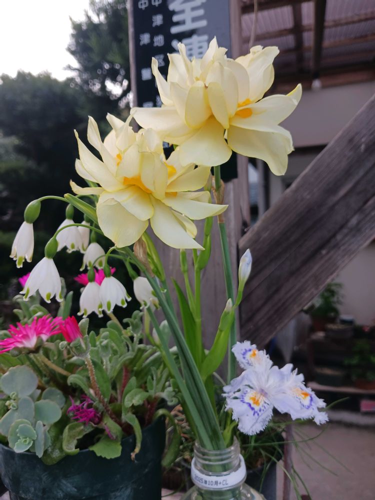 夕方、庭散歩しました。5枚目は水仙やシャガ、スノーフレークを外に飾ってみました。