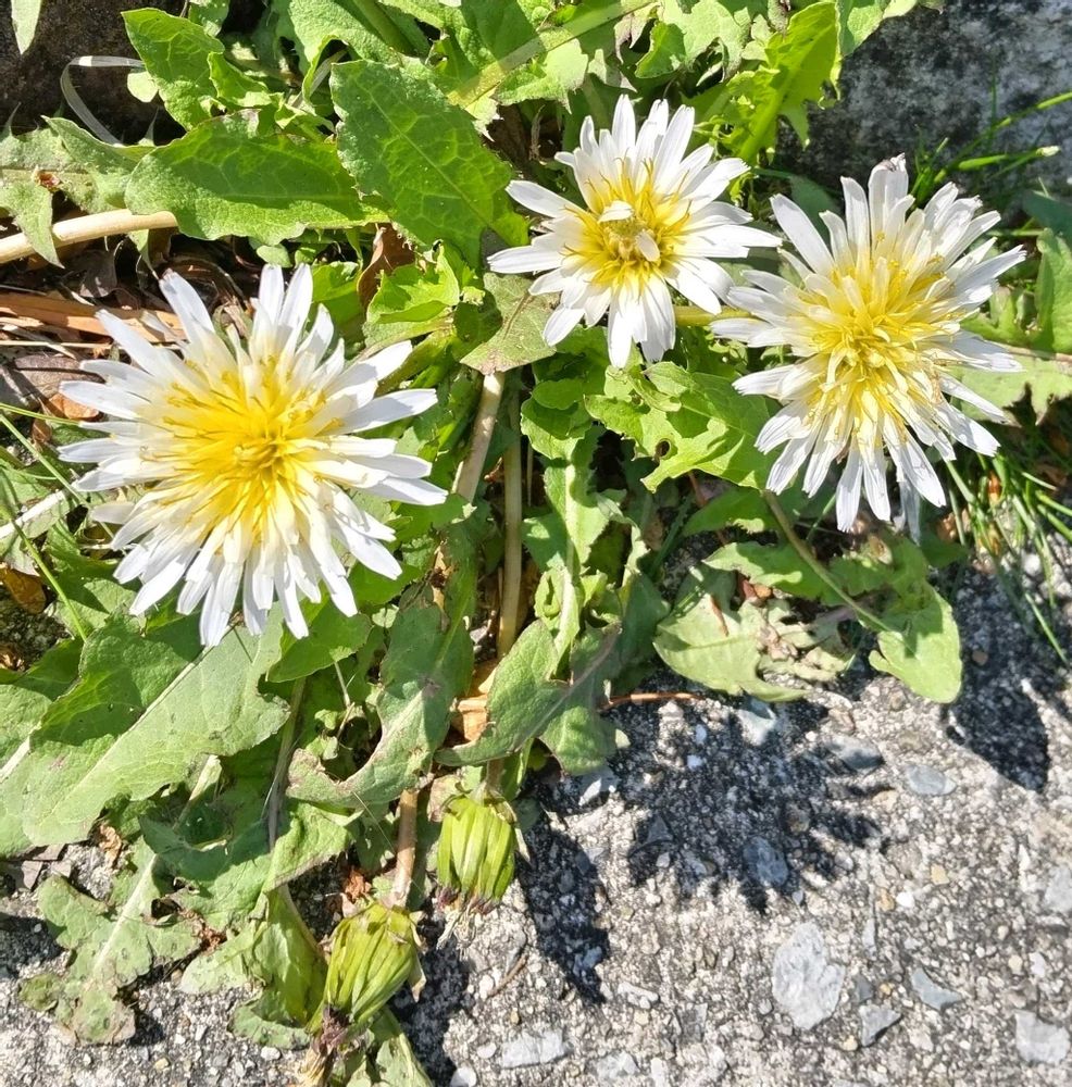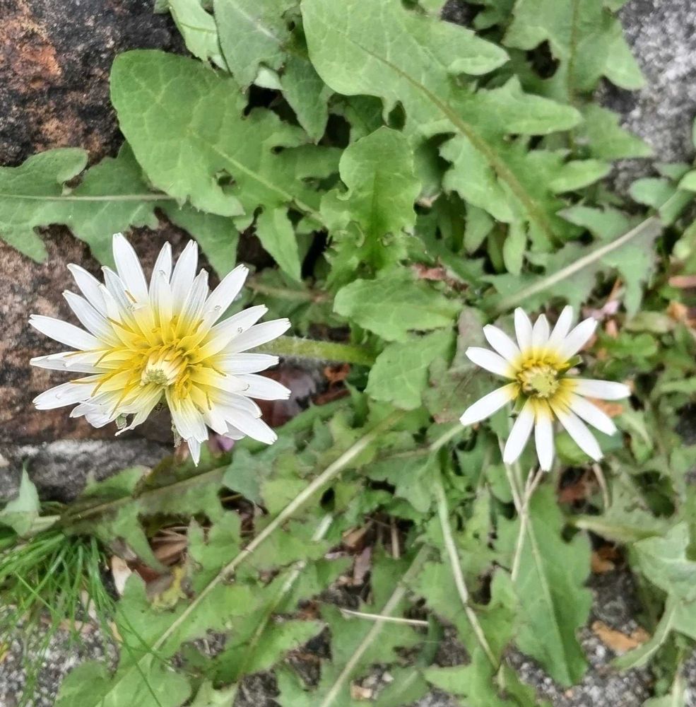 数年前に歩道と石垣の隙間に生えているのを見つけたシロバナタンポポ。