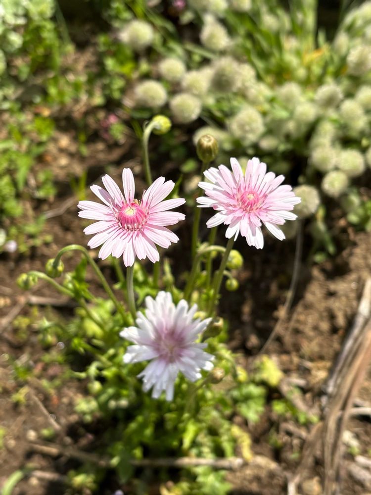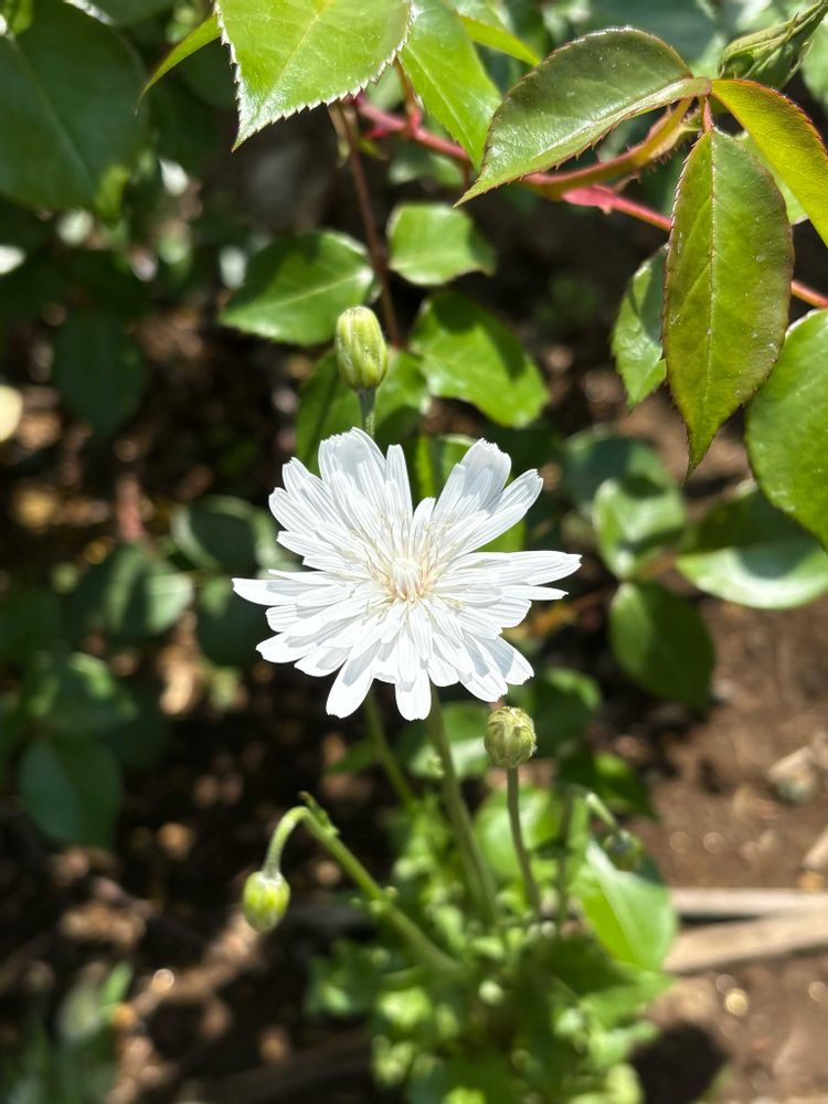 4枚目 花友さんにいただいた種を蒔いたら、1株だけ白いお花が咲きました。シロバナモモイロタンポポ⁉️