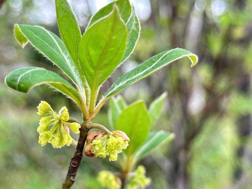 クロモジは新葉と花が同時で若緑色の葉は意外と白い毛でもふもふしてます😊