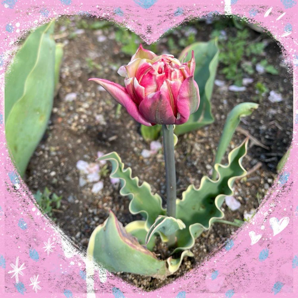 八重咲きはまた違った華やかさがありますね〜チューリップに見えないかしら😅葉っぱは斑入りでクネクネしてました🍃