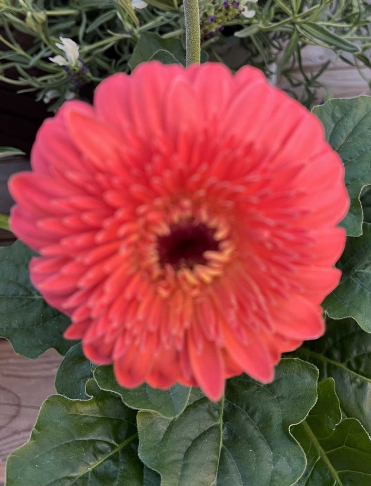 朱色のガーベラです。艶やかな色に中目ですねー!