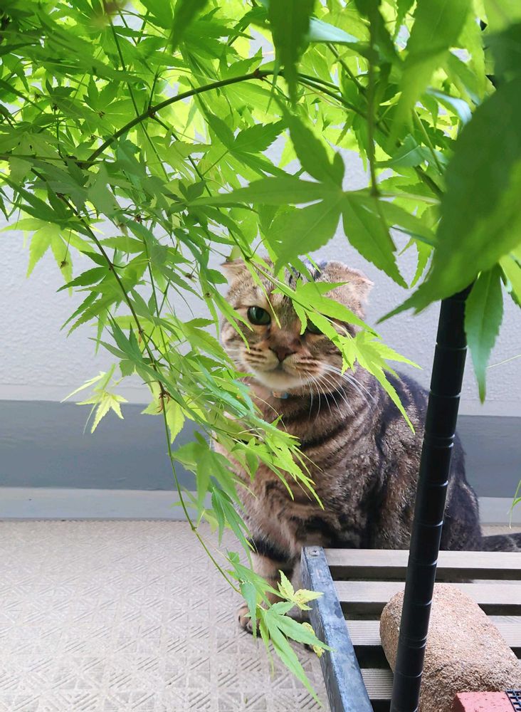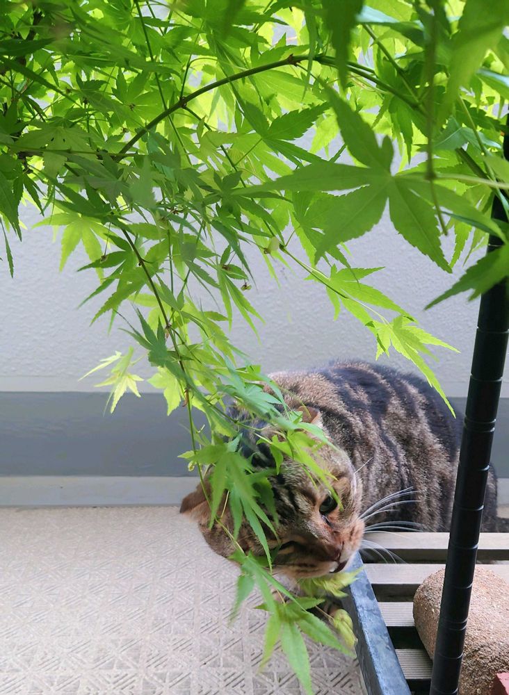猫ちゃん元気ですね😊モミジをかじるのね😅