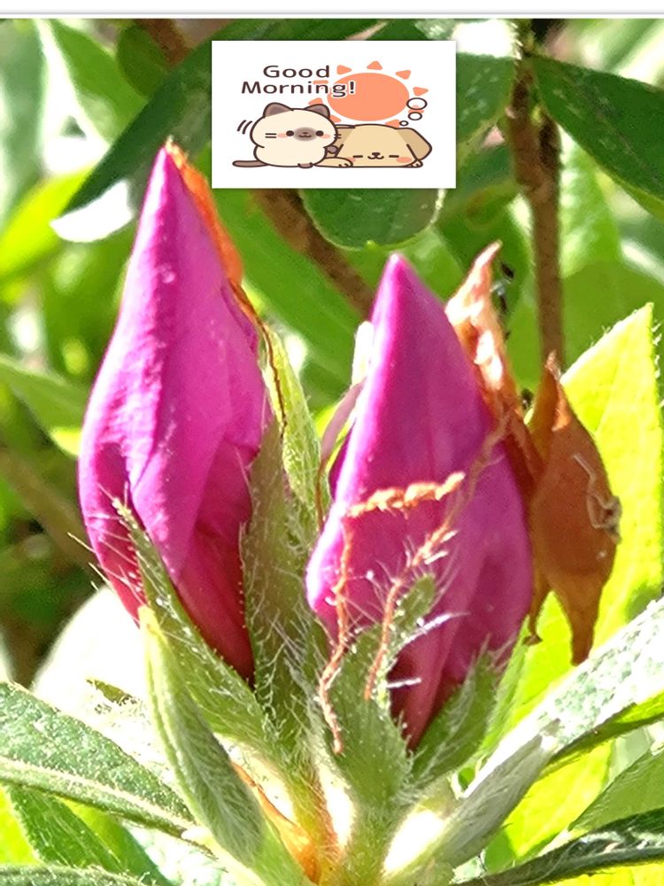 お庭にツツジ🌼があるんね🎵太陽の光で輝く蕾、綺麗