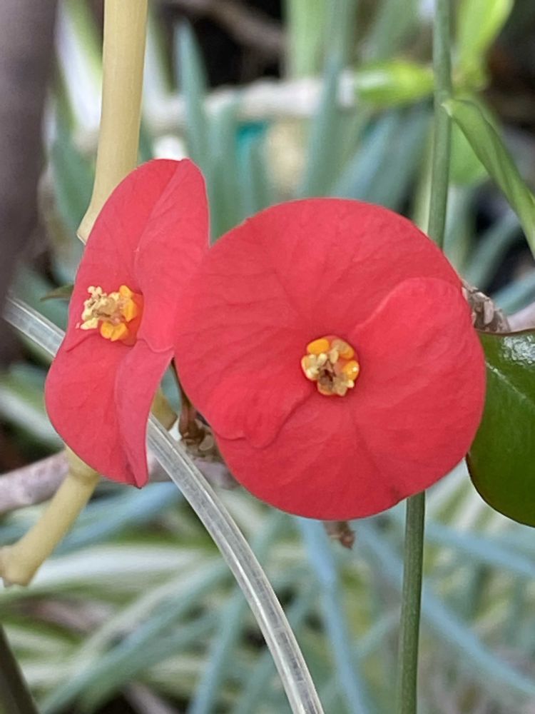たまたまトゲなしハナキリンと同じ場所に咲いていたので、赤花ツーショットです。