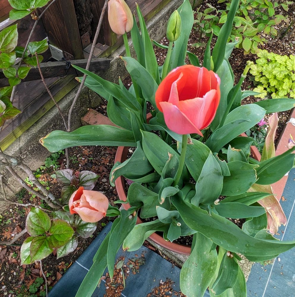 チューリップが同じ球根を植えた鉢なのに手前はとっくに花は散ったのに今、咲き始めた球根も有ります🌷
