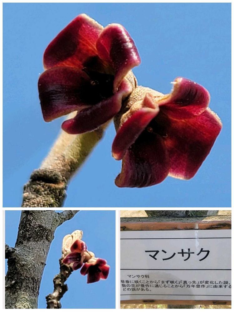 早春に咲くことから「まず咲く」「真っ先」が変化した説、多数の花が豊作に通じることから「万年豊作」に由来するなどの説がある。(プレートから)