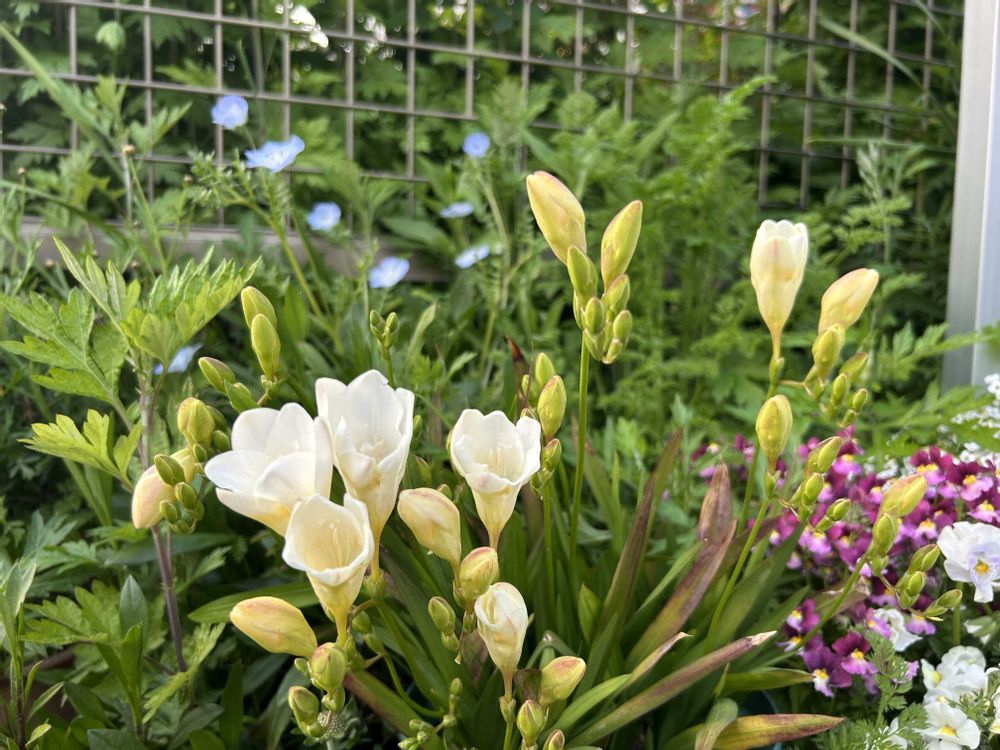昨年秋から、草花を大量に植え付けているのですが、やはりフリージアの花は際立ちます。他の植物と一緒に育てた方が、花の立ち具合も違う感じがします。