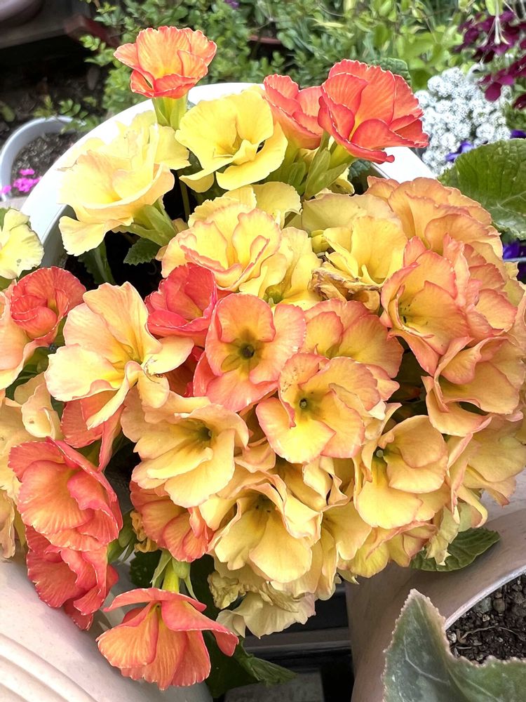 プリムラジュリアン、素敵な色合いですね💓ひとつで何色分かの色を見てるみたいです☺️単色では,見れない華やかさがありますね☺️