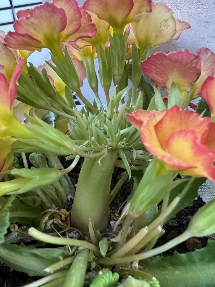 "プリムラジュリアン“3度の満開を終えて、これで最後かなと株元を除いたら、太い茎が‼︎(⑤枚目)