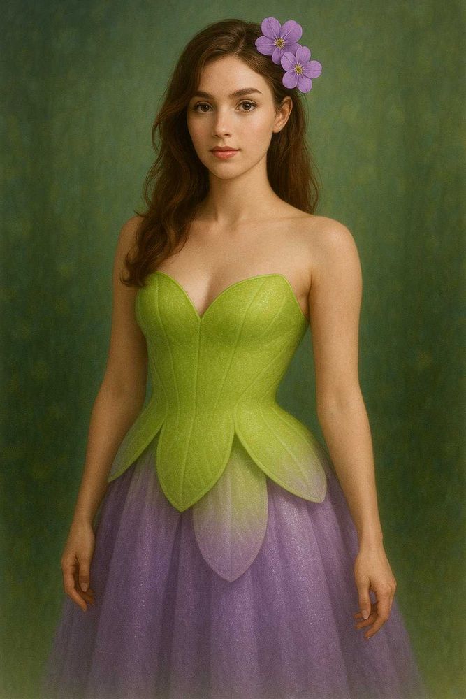 植物のムシトリスミレをモチーフにしたワンピースドレスを纏ったセクシー美女を描いて