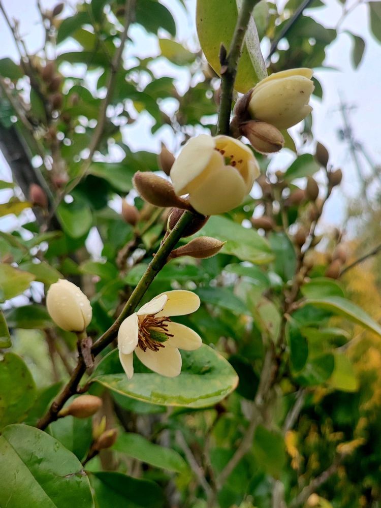 オガタマも咲き始めました。見た目はとにかく地味なんですが、ミックスフルーツオレみたいな面白い香りがしますw 花ガラが大量に落ちるので、掃除しなくてもいいようにうちは庭の内側の方に植えています。