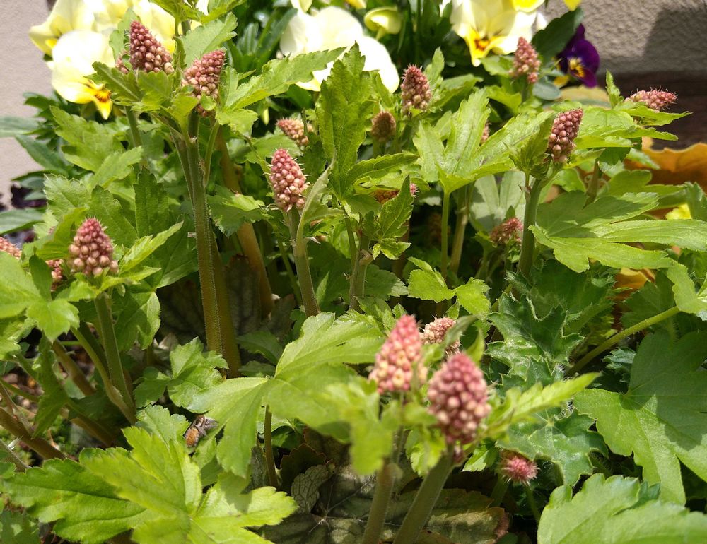 ヒューケラは色々な花色がありますが、茎が上に伸びた先に花を付け、開花はまだ先になります。また花の形が違います。