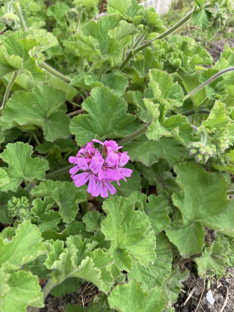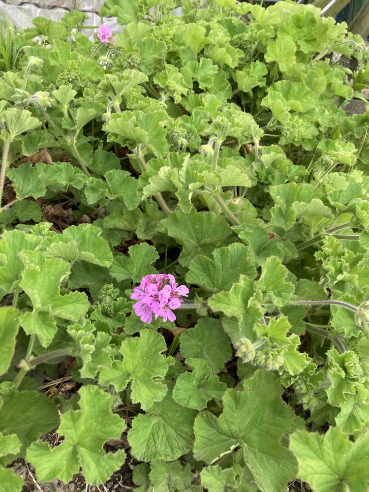 ローズゼラニウムの花が咲き始めました。冬に地面が見えるぐらい剪定したのですがいつの間にか葉が茂っていました。