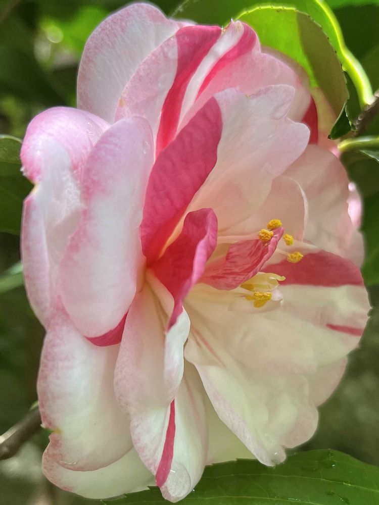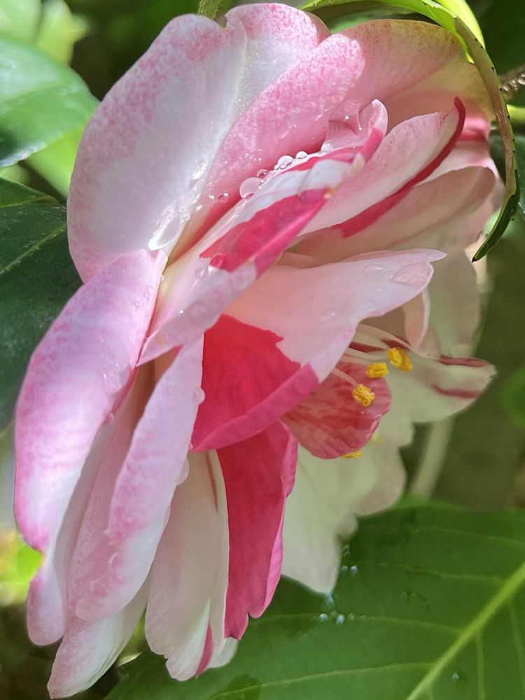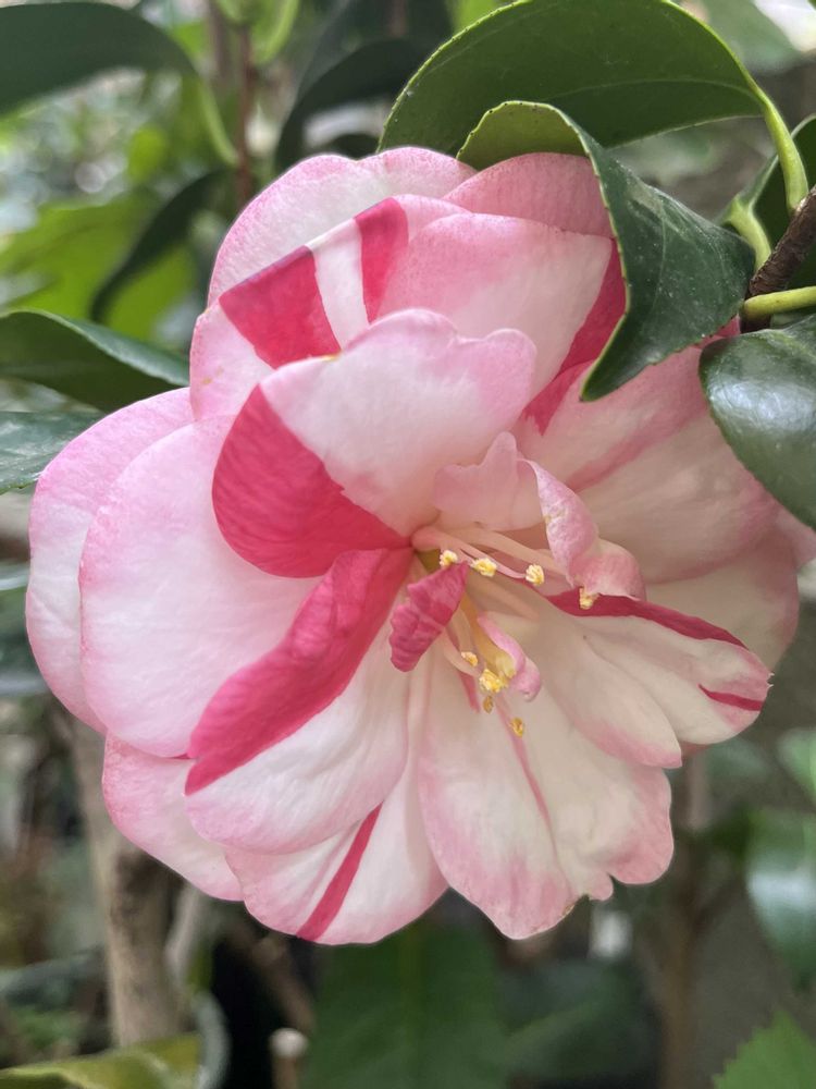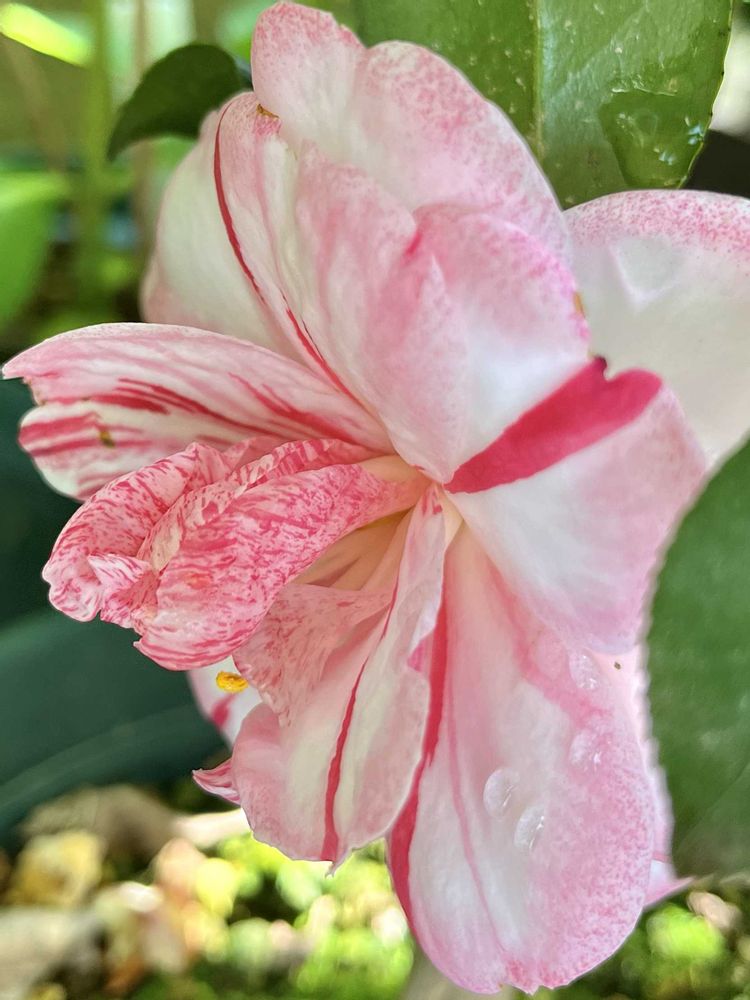 椿・越の麗人💕咲き分けた吹き掛け絞りのコとのハーフ(?)ちゃんがいましたオォ(*˙꒫˙* )🌟超低いところに咲いていて、奥に置いてる鉢なので1枚目しか撮れませんでした