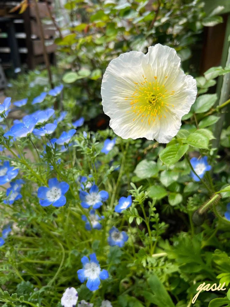 ④陽当たりが良いので2つを追加して3種のつるバラ花壇のはずが、避難所を南に設置したため陽が入らず😭 徒長したネモフィラの間から白いポピーが1輪咲いてました🤍