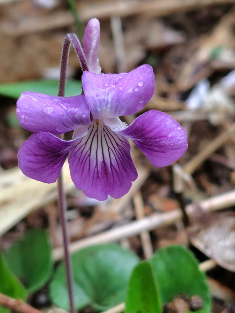 タチツボスミレに似て紫が色濃く、花の中央部が白く抜けているのが特徴である。