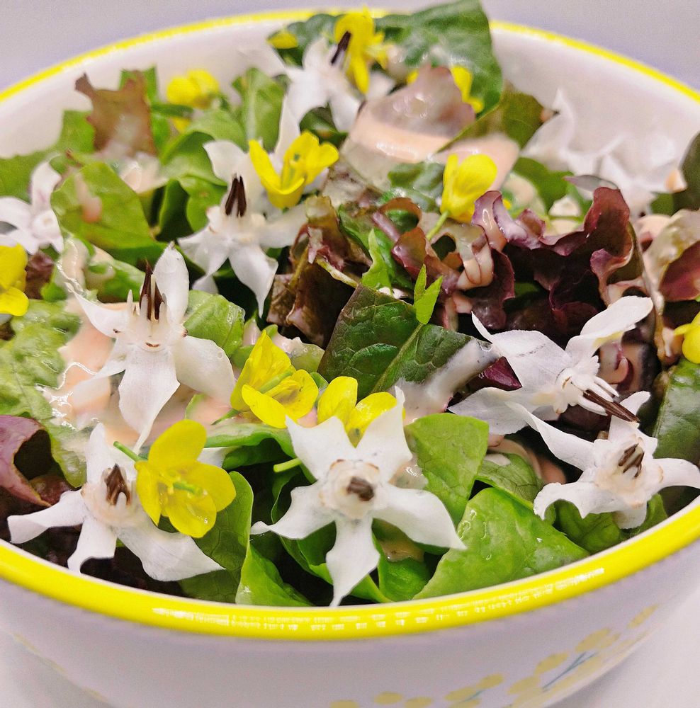 ボリジはほんのり甘くてサラダ🥗にぴったりです✨サザンアイランドとの相性も良かったです🥰昨年は青ボリジだけだったんですが、今年は白ボリジしかこぼれ種で大きくなってなくて…。今小さな芽が青ボリジだったら、もっと華やかなサラダになったことでしょう💙💚💛🤍