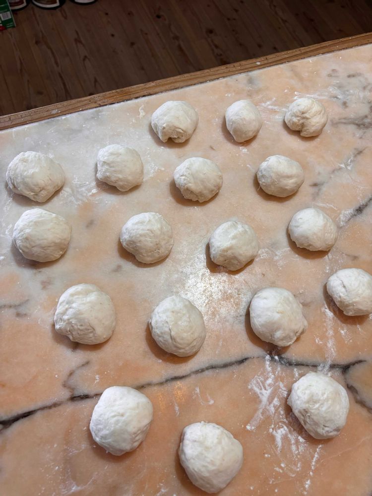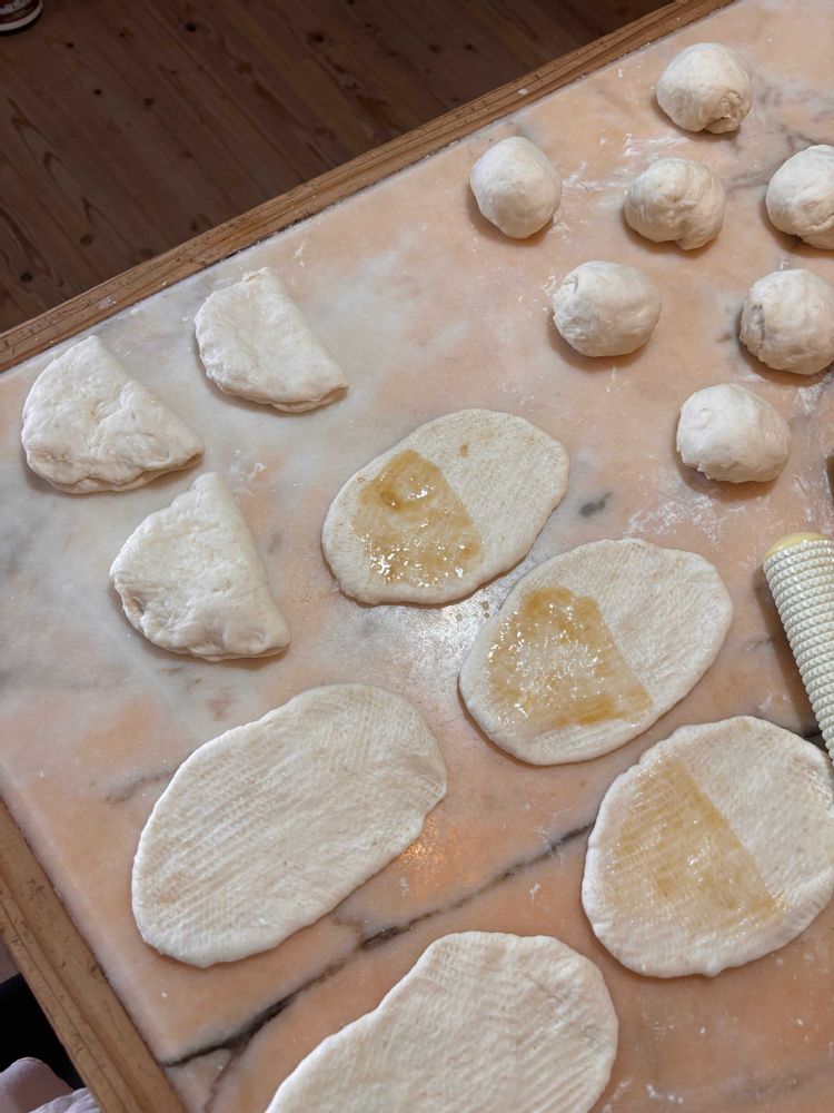 (蒸しパン生地は、40から50gに分割、少し休んで、長い楕円に伸ばす。