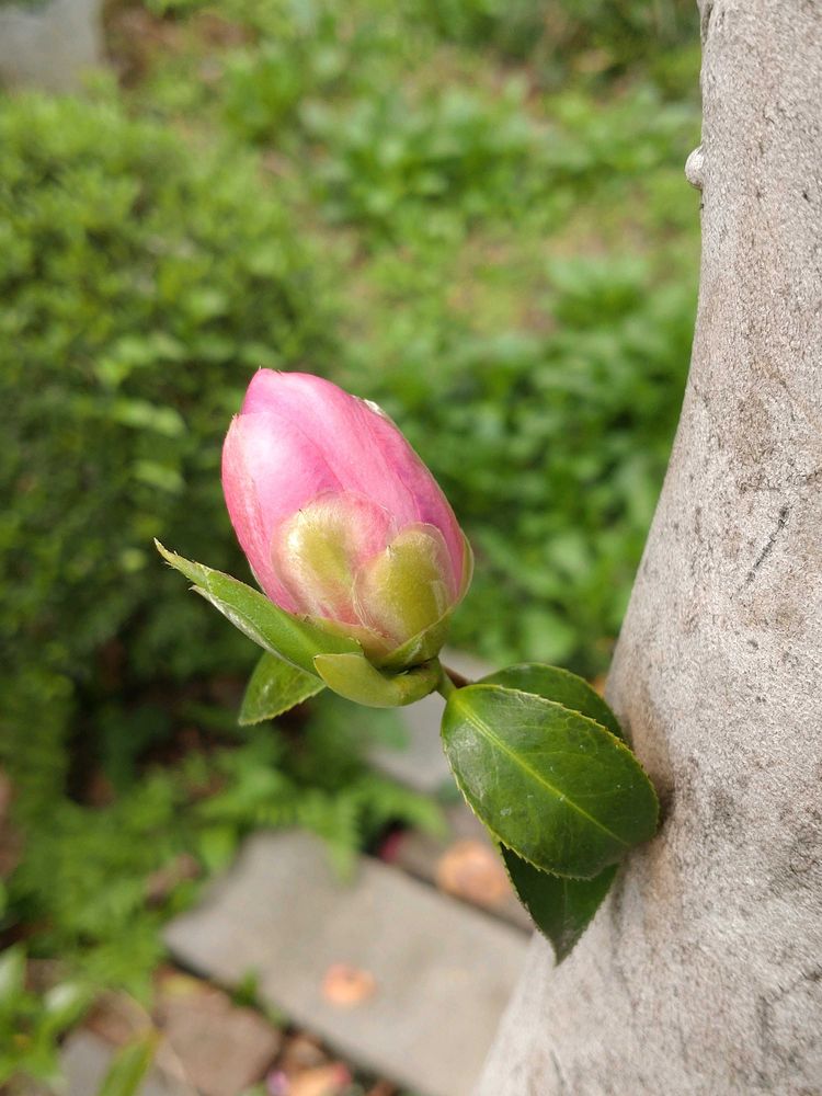 ⑤ 今朝の庭のツバキの蕾 太い幹から直接が