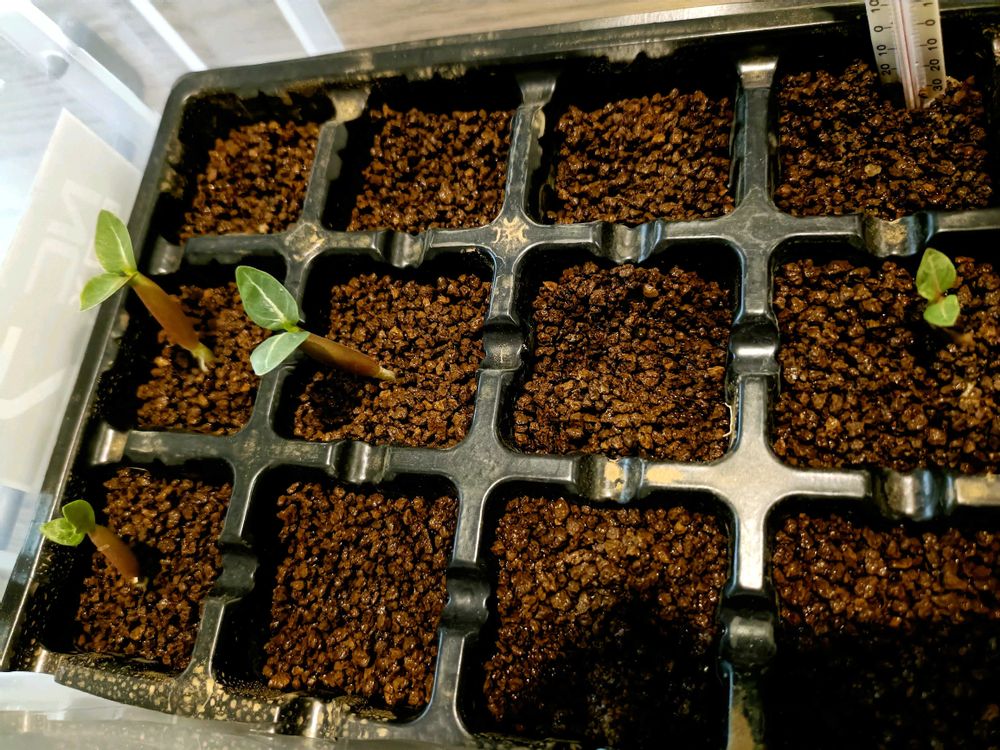アデニウムアラビカム。十粒ま撒いて、4粒発芽しました。二株元気で二株ひょろひょろです。もう少し大きくなったら、植え替えします。