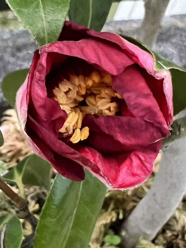 赤い椿ですが、色が黒っぽくて花糸が赤い…