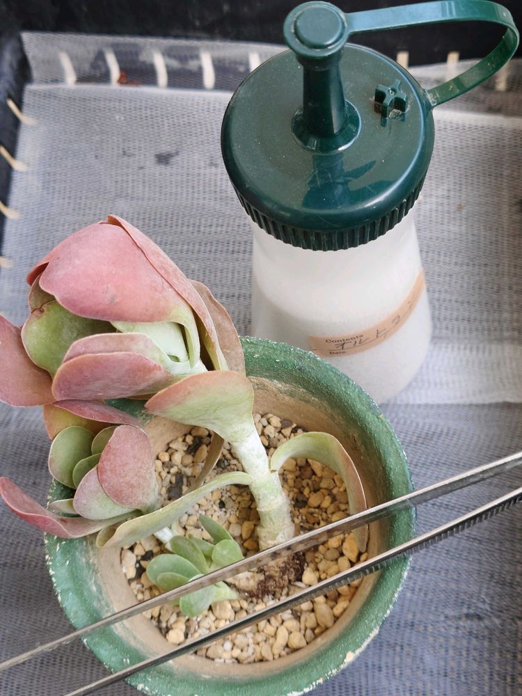 鉢底ネット→鉢底石→多肉用土を少し入れたらオルトラン粒剤を少し撒く→土を追加→苗を立て安定するまで周りに土を入れる→土の表面に再度オルトラン粒剤を撒きピンセットで馴染ませる。