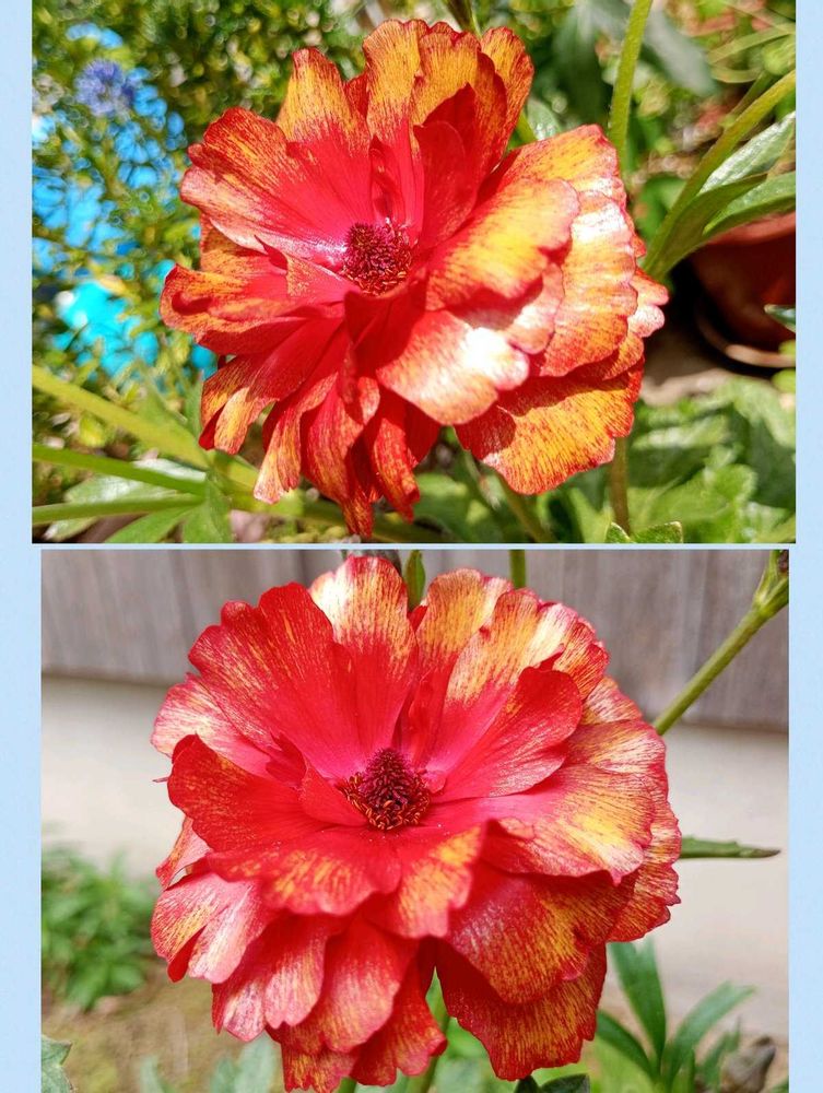 ラナンキュラス、ラックス❤️🧡も🍀同じ方から株分けを頂き〜車庫で冬越し。今は玄関脇の『主役🩷🩷&🧡❤️』です🥰