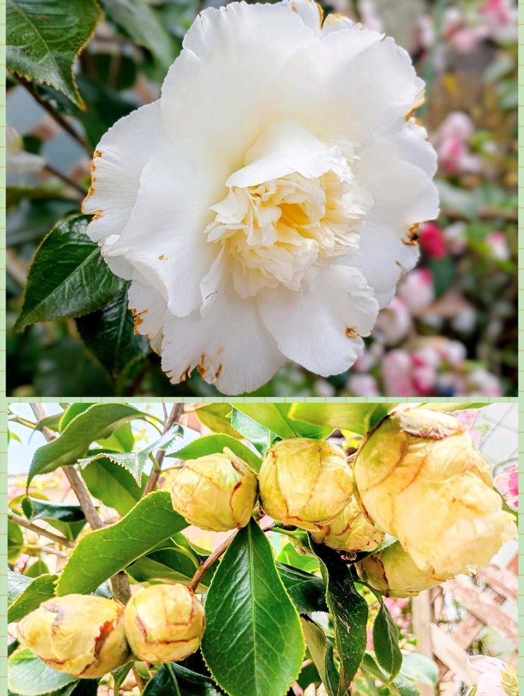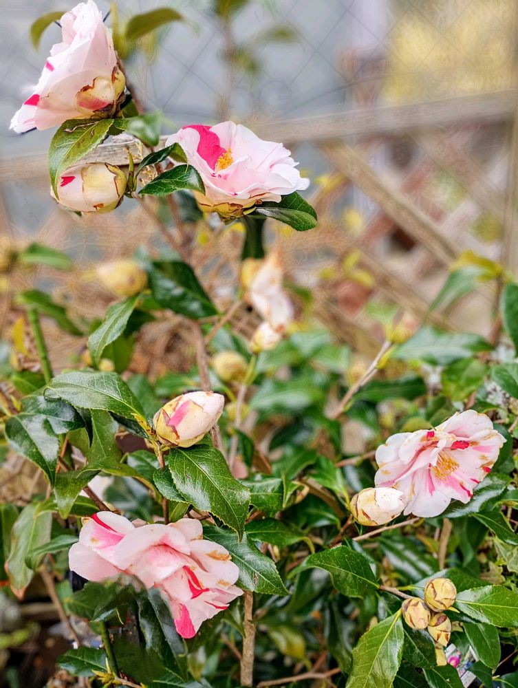 椿、エレガンスシャンパン。今年は、1輪目から綺麗に咲き たくさんの蕾に期待大です