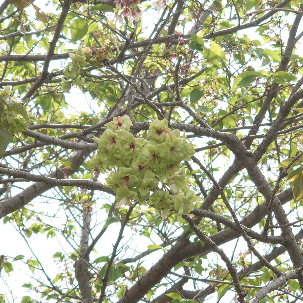 近所の川沿いに1本だけ毎年咲くギョイコウザクラ〜緑なので近寄らないと咲いてるのかどうか分からない〜💛💚